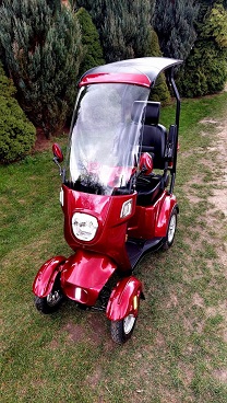 Czas do pełnego naładowania to 6-8h. Skuter posiada w standardzie oświetlenie typu LED, kierunkowskazy, wskaźnik rozładowania, komfortowy fotel z zagłówkiem, koszyk zakupowy ( zamykany z góry), alarm antywłamaniowy, 3 pozycje regulacji prędkości (plus regulacja prędkości na manetce), uchylne podłokietniki, amortyzowane zawieszenie, hamulce bebnowe, lusterka boczne, błotniki na przednie kola, 2 funkcjonalne podręczne schowki. Skuter idealny dla osób z problemami w samodzielnym poruszaniu się. Bardzo prosty w obsłudze -nawet przez osoby starsze.